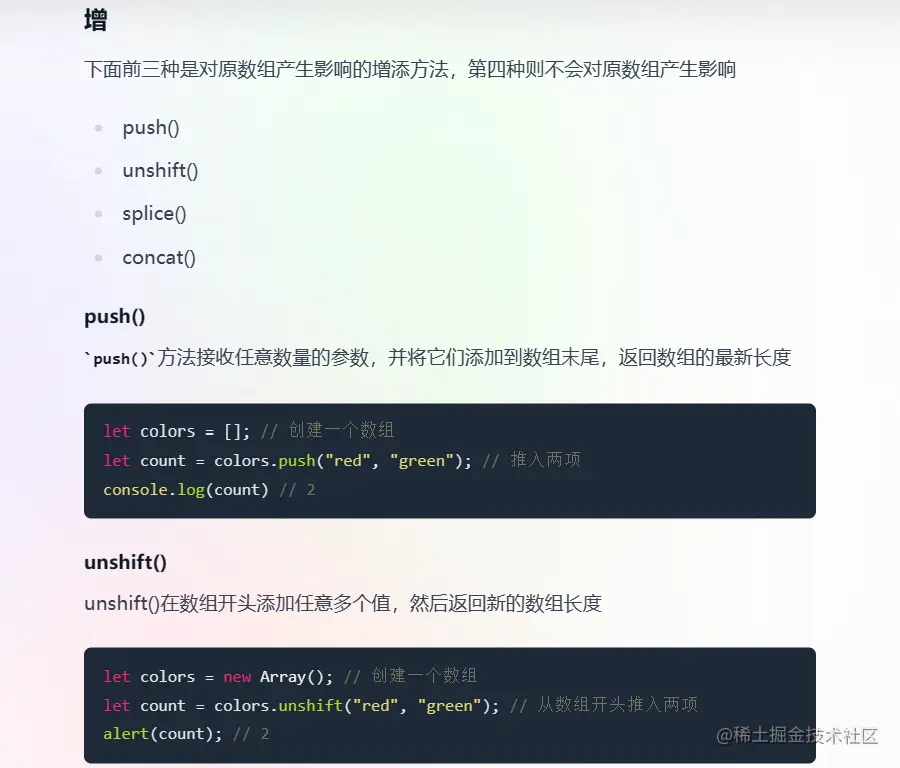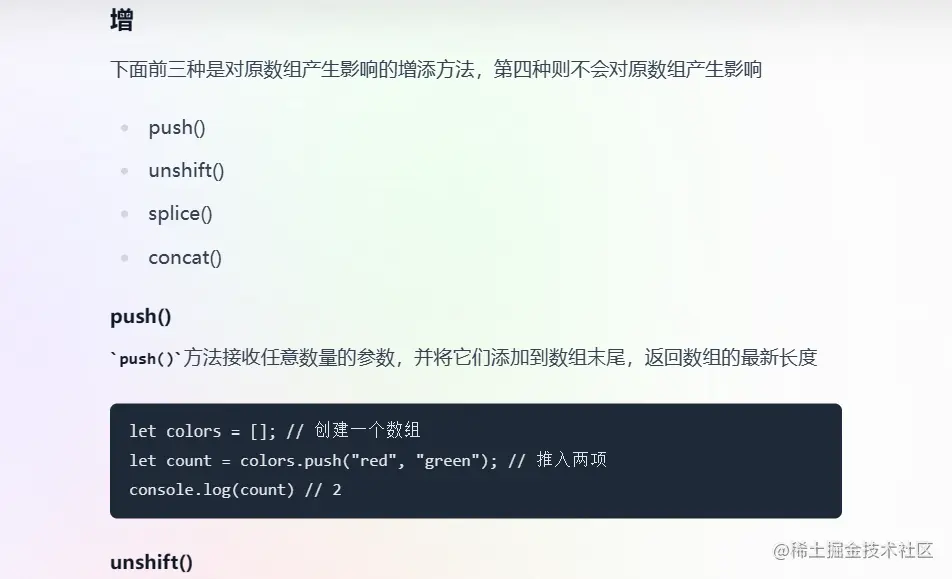 6. 常用的数组方法有哪些? concat() 方法用于合并两个或多个数组。此方法不会更改现有数组,而是返回一个新数组。