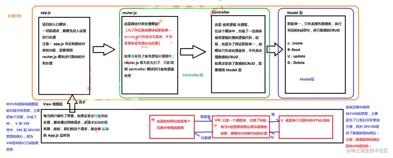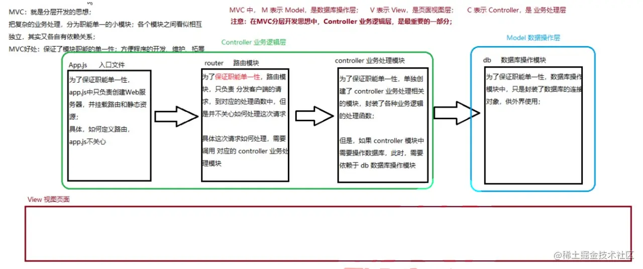 MVC: MVC 即 model-view-controller(模型-视图-控制器)是项目的一种分层架构思想,它把复杂的业务逻辑, 抽离为职能单一的小模块,每个模块看似相互独立,其实又各自有相互依赖关系。它的好处是: 保证了模块的智能单一性,方便程序的开发、维护、耦合度低。