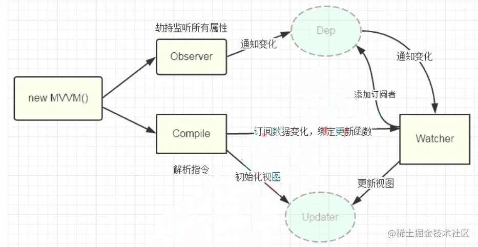 第四步: MVVM 作为数据绑定的入口,整合 Observer、Compile 和 Watcher 三者,通过 Observer 来监听自己的 model 数据变化, 通过 Compile 来解析编译模板指令,最终利用 Watcher 搭起 Observer 和 Compile 之间的通信桥梁,达到数据变化 -> 视图更新; 视图交互变化(input) -> 数据 model 变更的双向绑定效果。