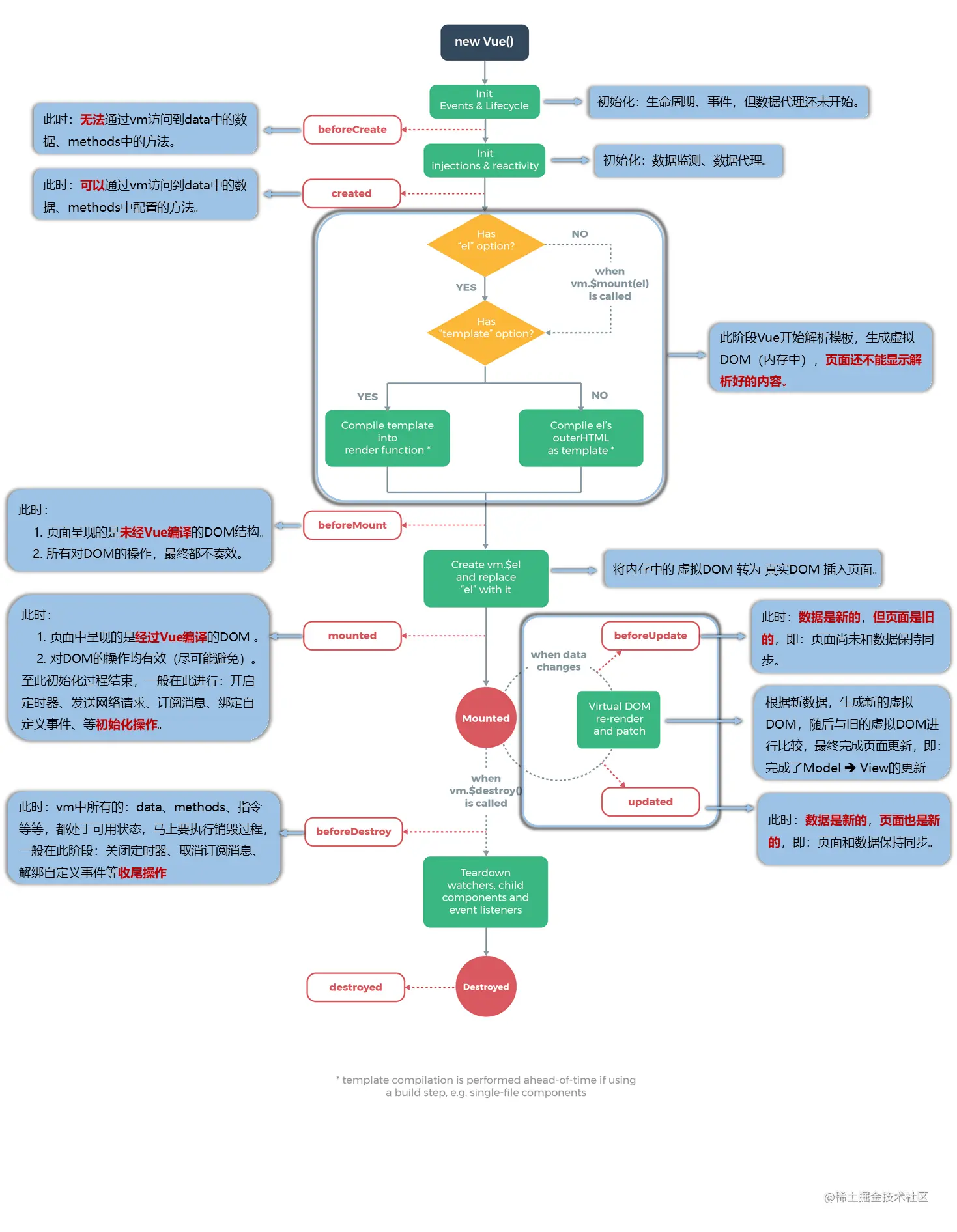 销毁前/后 在beforeDestroy 生命周期函数执行的时候,实例进入准备销毁的阶段、此时 data 、methods 、指令 等还是可用状态 在destroyed生命周期函数执行的时候,实例已经完成销毁、此时 data 、methods 、指令等都不可用
