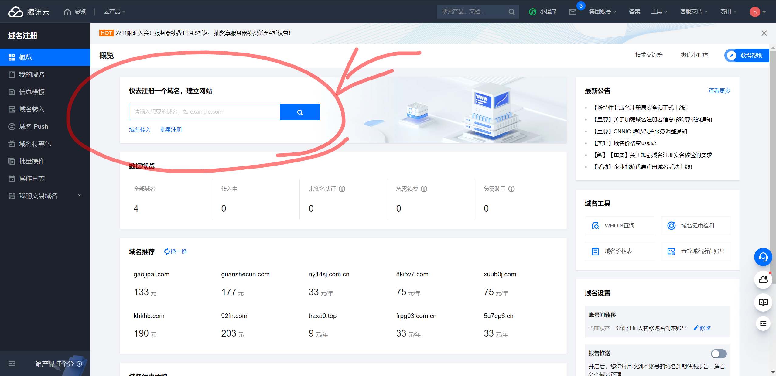 既然是要代理到原来的域名,所以得准备一个自己在国内服务商购买的域名。具体的流程应该都清楚的吧也就不多说了,在腾讯云里面你只用登录控制台然后搜“域名注册”四个字就会提示你怎么操作了。唯一的要求就是你要付钱,我建议便宜点就行。