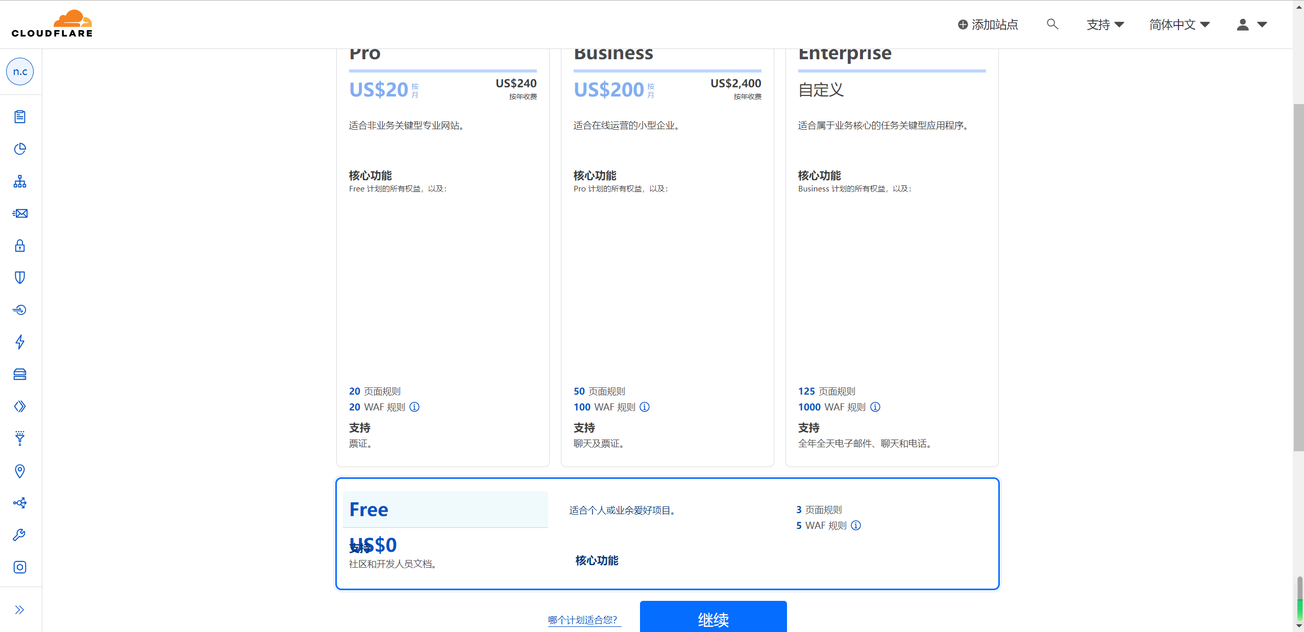 然后选择计划,一般无特殊需求直接白嫖然后点击继续:
