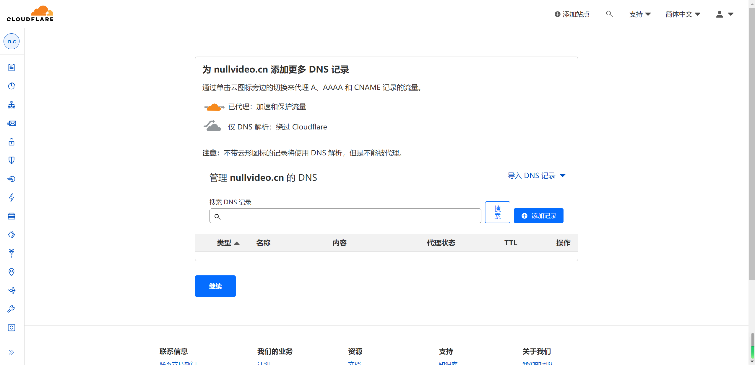 接下来 Cloudflare 会自动扫描你的部分dns记录。我这个域名是刚刚买的还没有进行一些解析的操作,所以是没有记录的。点击继续: