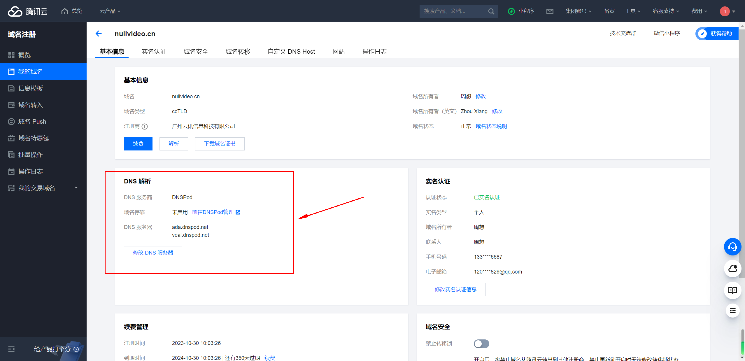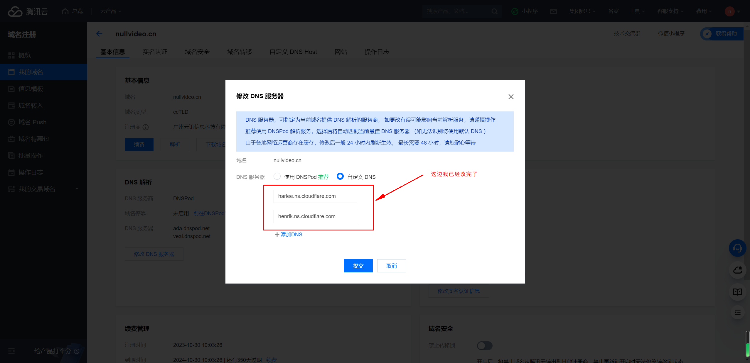 接下来启动腾讯云域名管理后台https://console.cloud.tencent.com/domain。我这边有一个是已经解析到cloudflare所以DNS状态变成了其他,我现在要改的这个nullvideo.cn待会儿也会变成其他。