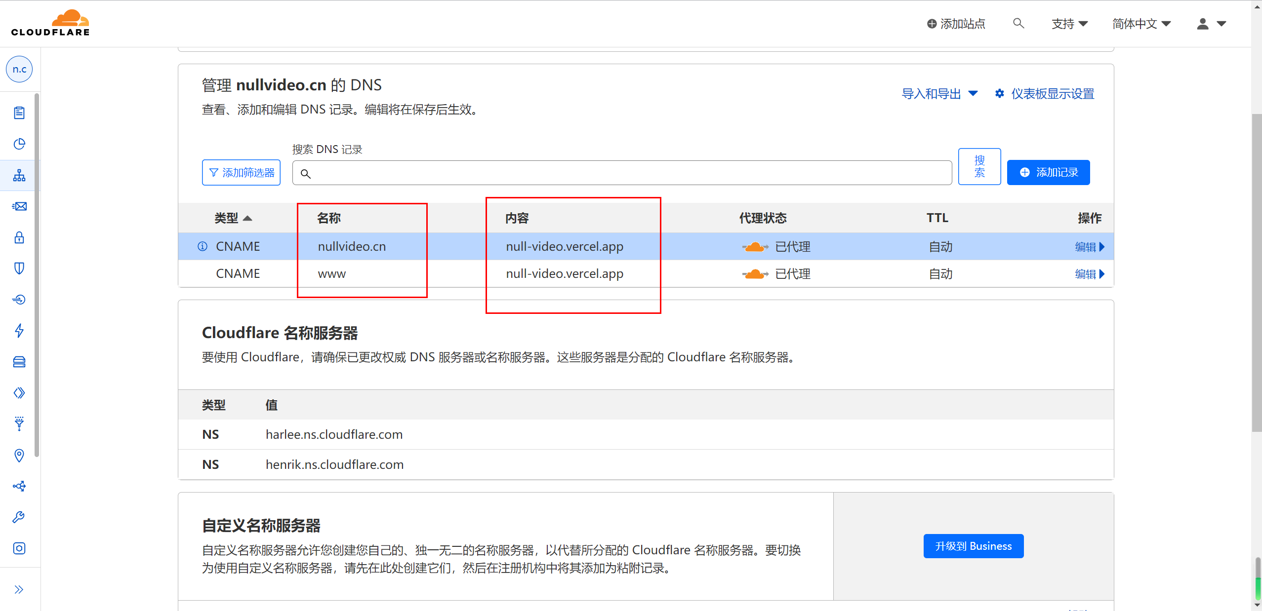 在 Cloudflare 添加CNAME类型的解析,比如这个项目就是把nullvideo.cn重定向到null-video.vercel.app,并打开 proxy 服务。我在这边为了对应根路径访问和www访问,两个都加上了。