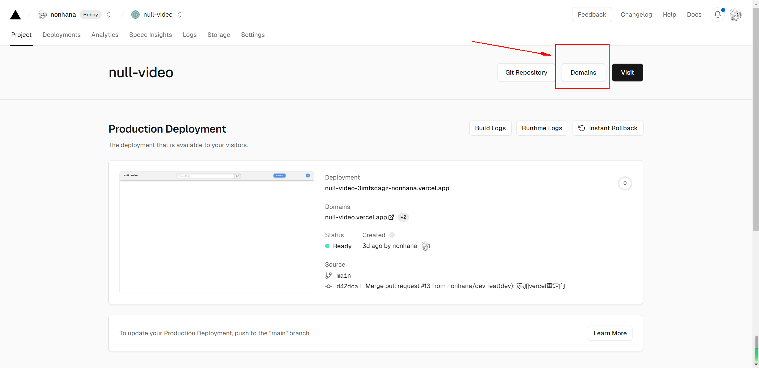 进入到部署好了的项目的主页,可以看到一个“Domain”的按钮,点击进入: