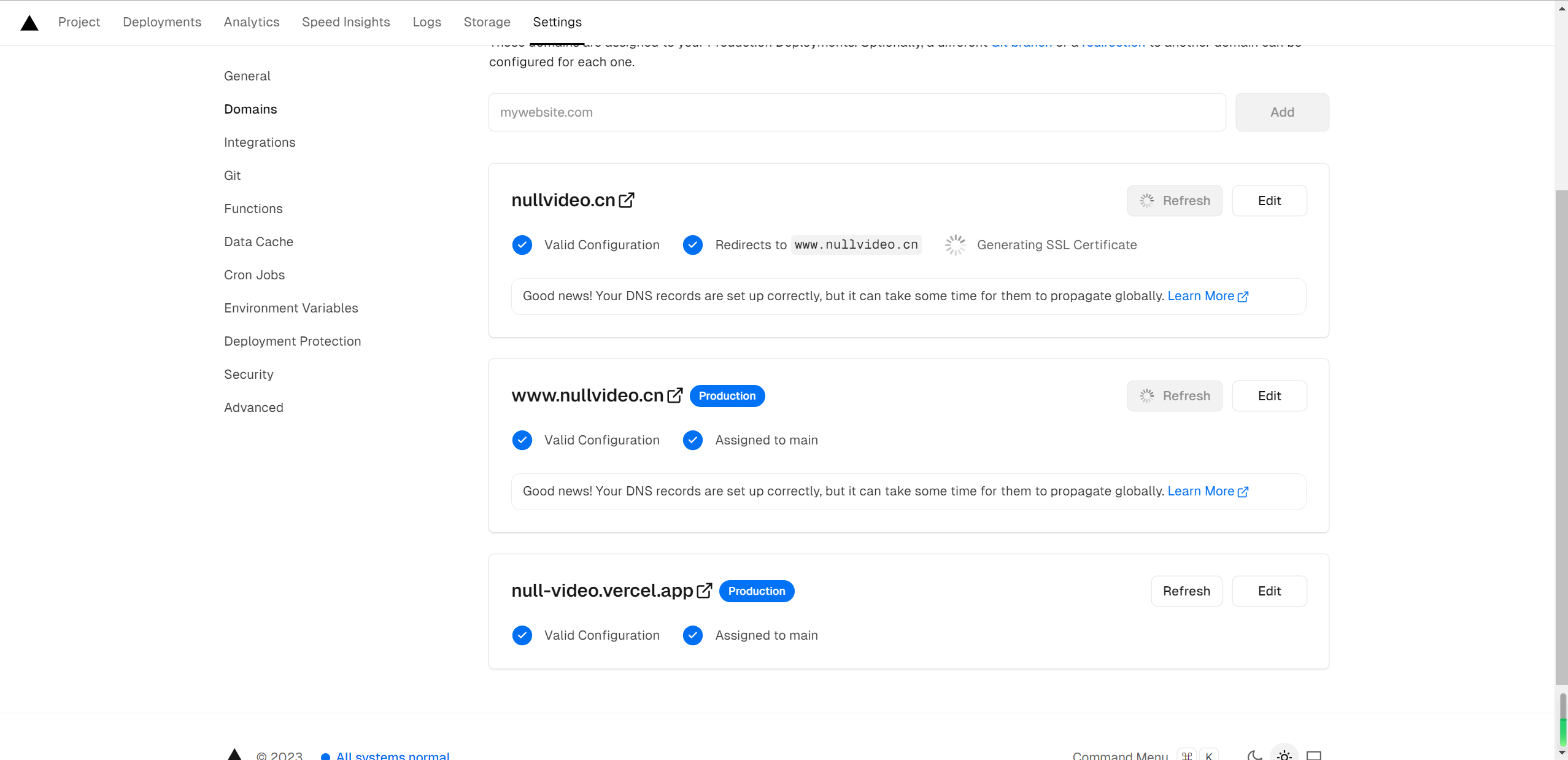 2.3 对部署好的vercel应用添加除了自带域名的新域名解析