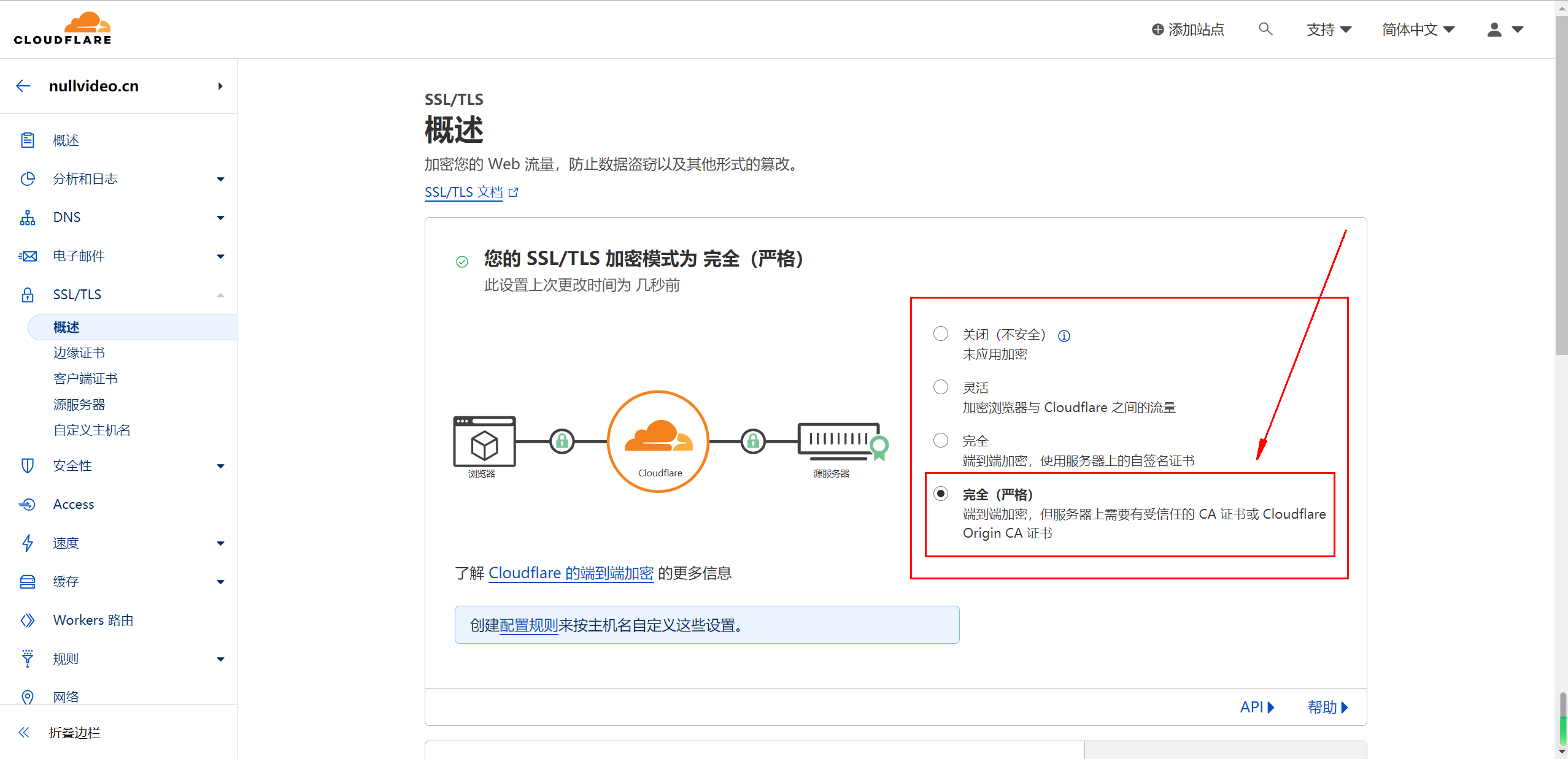 进入 Cloudflare Dashboard,点击有问题的域名,打开左侧的 SSL/TLS 设置,在 Overview 中设置加密模式为完全或完全(严格)即可。